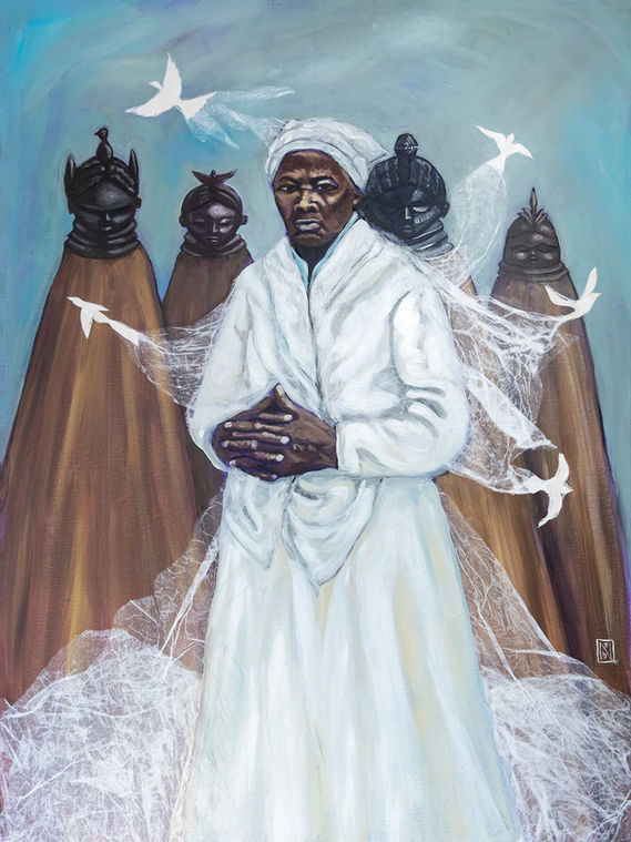A professional storyteller and self-taught artist, my paintings and multi-media art arise from the oral tradition. I explore the continuum of storytelling through the use of various mediums, surfaces, and natural and found materials, allowing the hand and eye to move a story into a place deeper, perhaps, then sound. This exploration reveals what may be hidden behind the words. The process of playing with and discovering what my hands and the materials will do is my spiritual practice and, as such, rises from an intensely personal place. My family of origin as well as the family I have created with my partner are important to this practice. The inclusion of collard greens in my work is a way of connecting to my family of origin through the simplicity of images that evoke the meals provided by the work of our own hands. It also opens the door to explore the ways community nurtures and supports us. Much of my work explores the rich traditions of the African American and Gullah Geechee communities that nurture my own creativity, as well as the process by which creative action shapes the communities themselves.